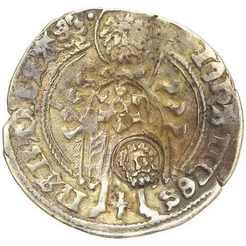 | Obverse description | Countermark City of Osnabrück (Six-spoked wheel with open hub, the spokes in the center pointedly extended) and City of Münster (Head of St. Paul) over Guilder `Sint Jansgoudgulden` - Arnold of Egmont (1423 - 1473) |
