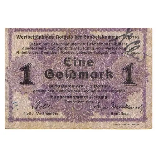 | Obverse lettering | Wertbeständiges Notgeld der Handelskammer Leipzig Dieser mit Genehmigung des Reichsfinanzministers ausgegebene und durch Hinterlegung von wertbeständiger Anleihe des Deutschen Reiches gedeckte Notgeldschein wird durch 1 eine Goldmark 1 (4.20 Goldmark = 1 Dollar) gemäß den umstehenden Bedingungen eingelöst. Handelskammer Leipzig November 1923 |