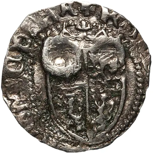 | Aversbeschreibung | Crowned shield with the emblems of the kingdom of Jerusalem, the Lusignans, the king of Armenia and the kingdom of Cyprus, surrounded by a beaded ring. Another beaded ring on the rim, with the inscription between the rings. |