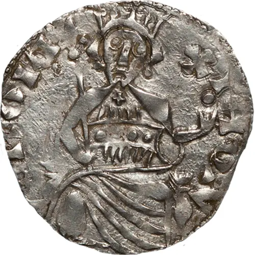 | Beschrijving voorzijde | The king sitting on a throne, holding an unsheathed sword in right hand and a globus cruciger in his left, surrounded by a beaded ring. Another beaded ring on the rim, with the inscription between the rings. |