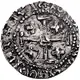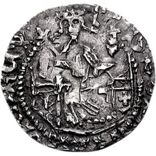 The king sitting on a throne, holding a scepter in right hand and a globus cruciger in his left, surrounded by a beaded ring. Another beaded ring on the rim, with the inscription between the rings. |