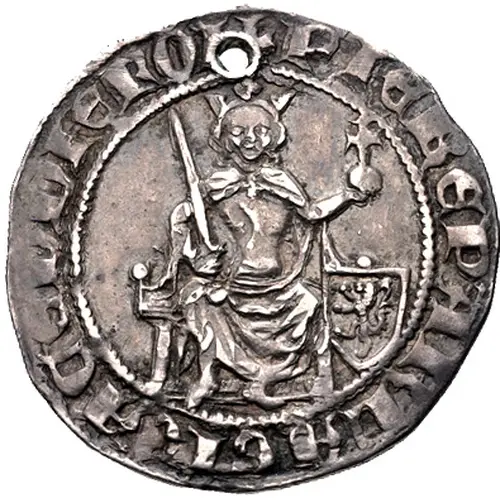 The king sitting on a throne, holding an unsheathed sword in right hand and a globus cruciger in his left, surrounded by a beaded ring. Another beaded ring on the rim, with the inscription between the rings. |