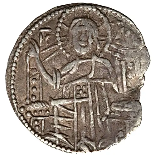 Crowned king on horseback advanicng right; holding sceptre surmounted by cross; МХ with overbar in left field; ЦАР (as monogramm) Ђ to right of kings head; border of dots. |