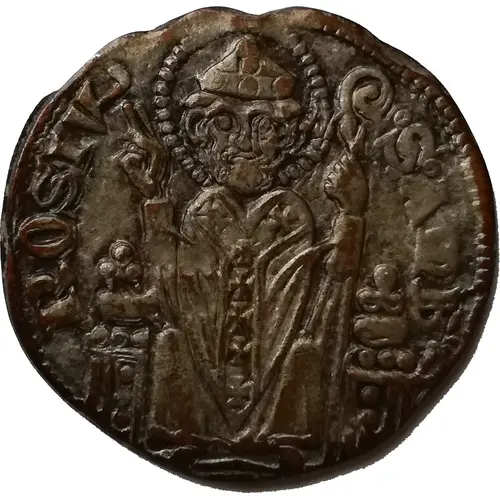 | Obverse description | Sant`Ambrogio mitrato and nimbato, seated in front, blessing with the right, holds the ministry in the left. Beaded edge. |
