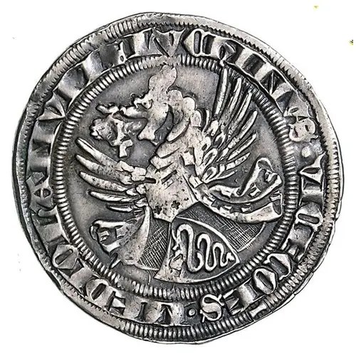 | Description de l’avers | Ornate helmet topped with biscia (serpent eating a man), and shiled with Visconti arms below, all wthn reeded circle. |