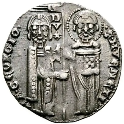 | Obverse description | Doge (duke) stands facing receiving banner from patron saint St. Mark. |