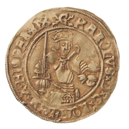 Half-length figure of Charles facing forward, crowned and armored, holding sword in right hand and imperial orb in left, within beaded inner circle. Mintmark at end of legend. |