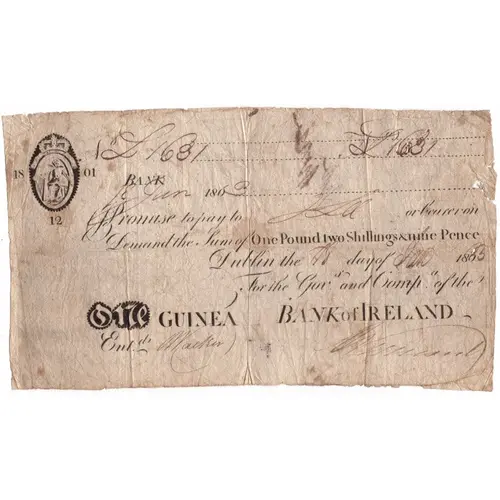 | Obverse lettering | I Promise to pay ... or bearer on Demand the sum of One Pound two shillings & nine pence Dublin For the Gov.r and Comp.a of the Bank of Ireland |