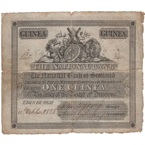 | Obverse lettering | THE NATIONAL BNK The National Bank of Scotland Promise to pay to Matthew Edwards or Bearer on demand ONE GUINEA Sterling By order of the Board of Directors Edinburgh |