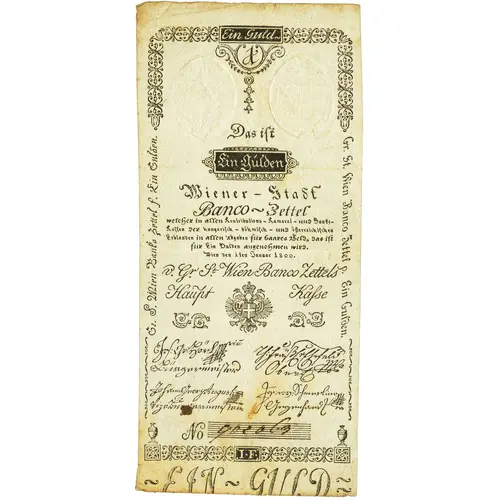 | Leyenda del anverso | Ein Guld ~ 1 Das iſt Ein Gúlden Wiener - Stadt Banco ~ Zettel Welcher in allen Kontributions – Kameral – und Banco – Kaſſen der hungariſch – böhmiſch – und öeſterreichiſchen Erblanden in allen Abgaben für Baares Geld, das iſt für Ein Gulden angenohmen wird. Wien den i ten Januar i800. v. Gr. St. Wien Banco Zettels Haupt Kaſse I . F . ~ EIN ~ GULD ~ Gr. S. Wien Banko Zettel f. Ein Gulden. Gr. St. Wien Banko Zettel p. Ein Gulden. |