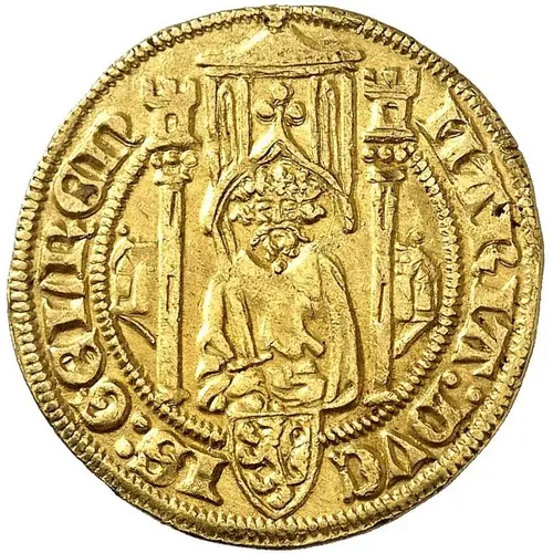 | Opis awersu | Duke Reinoud III (see comments) seated on throne under a gothic canopy. Guelders coat of arms below |