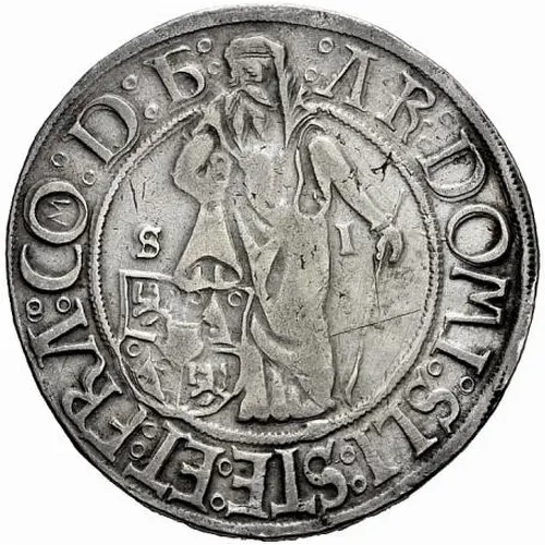 | Obverse description | St Joachim as pilgrim dividing the letters S I (for St Ioachim). Below left, composite arms (Weisskirchen in 1 and 4, Schlick in 2 and 3, at center, Bassano, Lion with a column). Legend (starts 12h) for `Argento Dominorum Slickorum Stefanus Et Fratres Comes Dominus Bassani`. M in COM within the O. |