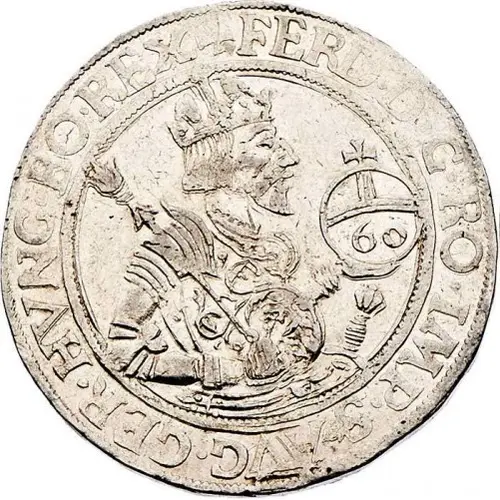 Portrait half size of Ferdinand I with beard, facing right, with sceptre and sword, holding an orb on the right with the value, in a double circle. Legend around for `Ferdinandus dei Gratia Romanorum Imperator Semper Augustus Germaniae Hungariae Bohemiae Rex` |
