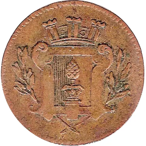 Obverse description Larger pine cone city arms between palm and laurel branches.