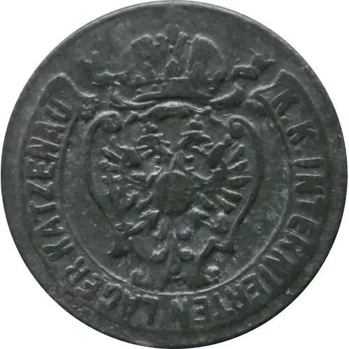 | Obverse description | Imperial eagle with small Austria shield at centre, baroque forme, crown. K K INTERNIERTEN LAGER KATZENAU Royal and Imperial Internment camp Katzenau |