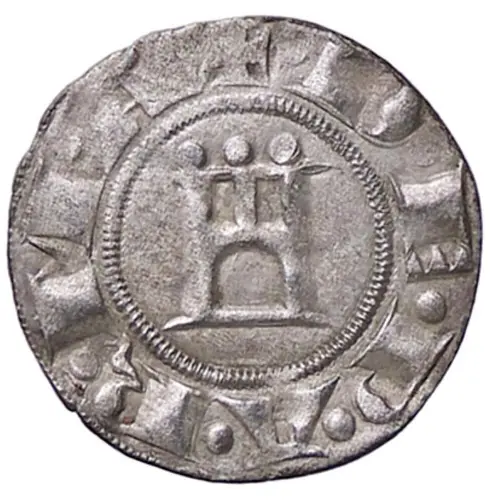 | Obverse description | Castle or gateway with three large pellets at top, within reeded circle. |
