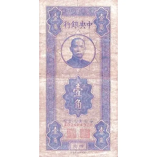 | Obverse lettering | 行銀央中 壹 角 (Translation: Central Bank of China One Jiao) |