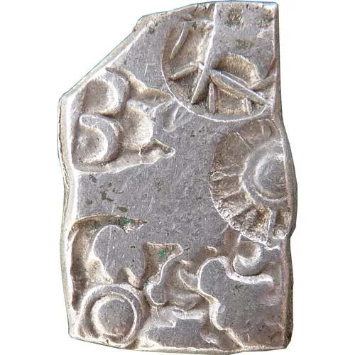 | 表面の説明 | Punchmarks: sun, six-armed symbol, three arched hill with crescent, plant with branches, zebu. All marks partly off flan. |