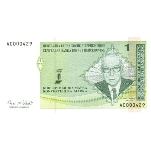 ЦЕНТРАЛНА БАНКА БОСНЕ И ХЕРЦЕГОВИНЕ CENTRALNA BANKA BOSNE I HERCEGOVINE 1 КОНВЕРТИБИЛНА МАРКА KONVERTIBILNA MARKA ЈЕДНА КОНВЕРТИБИЛНА МАРКА JEDNA KONVERTIBILNA MARKA ИВО АНДРИЋ 1892 – 1975 |
