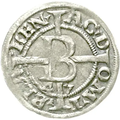 | Descripción del reverso | Large B superimposed on long cross, date divided by lower arm of cross or lower part of B. |