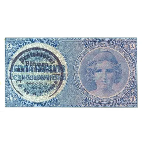 | Description de l’avers | On the left side we see a handstamp of the Protectorate of Bohemia and Moravia. The text on the handstamp or the machine overprint says Protectorate of Bohemia and Moravia in German and in Czech. Protektorat Böhmen und Mähren / Protektorát Čechy a Morava Below the handstamp we see a circle with flowers on the top and bottom and the value of the banknote and the name of the original issuing country in text. Surrounding the circle we see the text Republika Československá repeatedly. To the right side we see the portrait of a young woman. In each corner we see the face value of the banknote in numerals. |