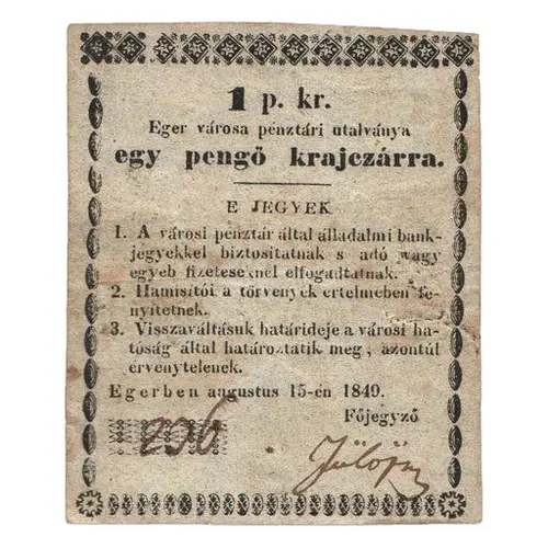 Obverse description Hungarian text in decorated frame; signed by János Fülöp, Town Clerk; handwritten serial number Eger, 15 August, 1849