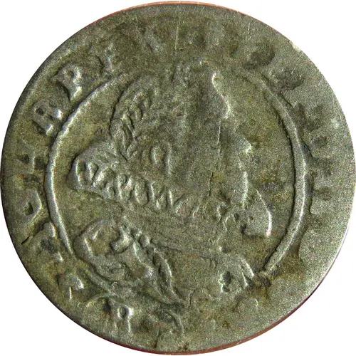 Portrait with ruffled collar facing right in a circle. Mint mark in legend below in a frame. Legend starts 12h with a sort of fleur de lys (or double trefoil) above the head. |