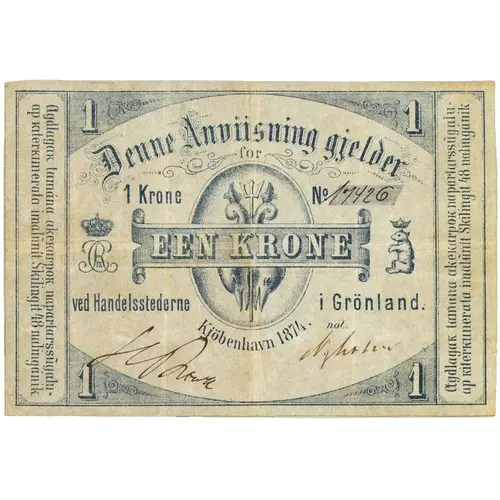 | Obverse lettering | Denne Anviisning gjelder for 1 Krone EEN KRONE ved Handelsstederne i Grönland. Kjöbenhavn 1874 AgdlagaK tamána akeKarpoK naparlangũgalaup KiterKunerata imalῦnît Skilingit 48 nalingánik. (Translation: This note is valid for 1 krone at the trading posts in Greenland Copenhagen 1874 This note costs one big barrel half full or 48 Skiling in value.) |