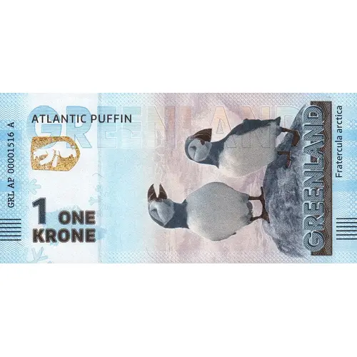 | Obverse lettering | ATLANTIC PUFFIN 1 ONE KRONE GREENLAND Fratercula arctica |