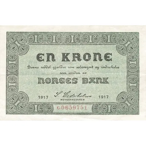 | Obverse lettering | EN KRONE Denne seddel gjælder som sølvmynt og indveksles som saadan av NORGES BANK 1917 P. Cederholm 1917 HOVEDKASSERER |