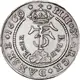 Arm holding sword and coming out left from cloud, cuts open hand reaching for Royal Crown; all is partially encircled within beaded circle. Legend outside the circle. |