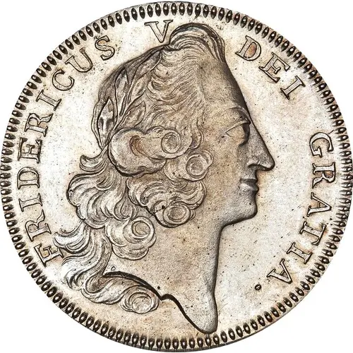 | Obverse description | Laureate head of King Frederik V with long and curly hair facing right. Initial of engraver on neck-cut. |