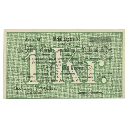 Betalingsmerke utstedt av Store Norske Spitsbergen Kulkompani Aktieselskap Mot dette betalingsmerke, som er utstedt for tilgodehavende løn, utleverer Store Norske Spitsbergen Kulkompani, til ihændehaveren varer for et -beløp av 1 - En krone Ubenyttede betalingsmerker blir ved ihændehaverens avreise fra Spitsbergen i sæsonen 1930/31 at tilbakelevere til kontoret mot beløpets godskrivning i opgjøret. Merket er ugyldig utenfor Spitsbergen og efter sæsonens avslutning. Styrets formand. Kontordjef, Spitsbergen. (Translation: Payment note issued by The Great Norwegian Spitsbergen Coal Company Against this payment note, which is issued for outstanding wages, The Great Norwegian Spitsbergen Coal Company delivers to the bearer goods for an amount of 1 krone Unused notes when the beares departs from Spitsbergen during the season 1930/31 is returned to the office against credit of the amount in the settlement. The note is invalid outside Spitsbergen and after the end of the season. Chairman of the board. Office manager, Spitsbergen.) |