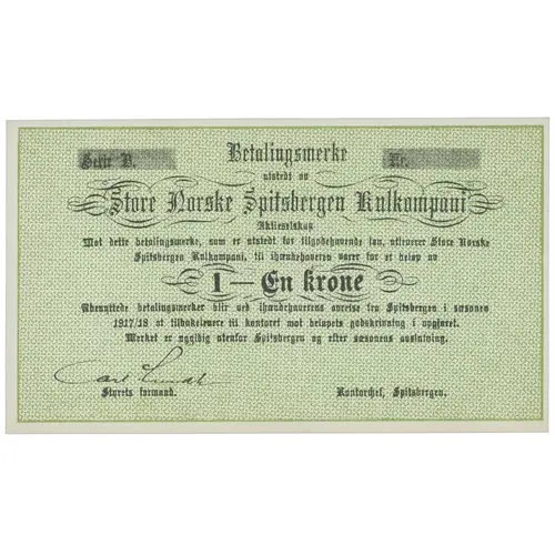 Betalingsmerke utstedt av Store Norske Spitsbergen Kullkompani Aktieselskap Mot dette betalingsmerke, som er utstedt for tilgodehavende løn, utleverer Store Norske Spitsbergen Kullkompani, til ihændehaveren varer for et -beløp av 1 - En krone Ubenyttende betalingsmerker blir ved ihændehaverens avreise fra Spitsbergen i sæsonen 1917/18 at tilbakelevere til kontoret mot beløpets godskrivning i opgjøret. Merket er ugyldig utenfor Spitsbergen og efter sæsonens avslutning. Styrets formand. Kontordjef, Spitsbergen. (Translation: Payment note issued by The Great Norwegian Spitsbergen Coal Company Against this payment note, which is issued for outstanding wages, The Great Norwegian Spitsbergen Coal Company delivers to the bearer goods for an amount of 1 krone Unused notes when the beares departs from Spitsbergen during the season 1917/18 is returned to the office against credit of the amount in the settlement. The note is invalid outside Spitsbergen and after the end of the season. Chairman of the board. Office manager, Spitsbergen.) |