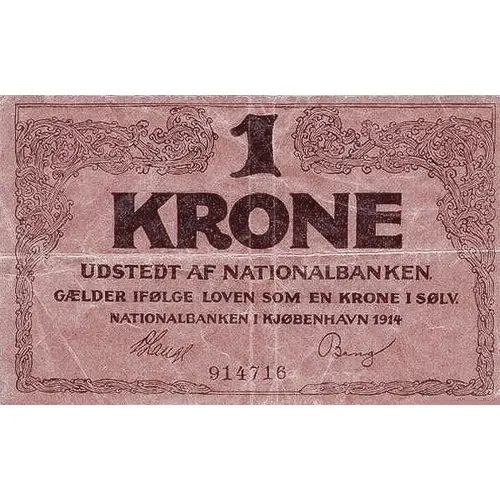 1 KRONE UDSTEDT AF NATIONALBANKEN GÆLDER IFØLGE LOVEN SOM EN KRONE I SØLV NATIONALBANKEN I KJØBENHAVN 2 SIGNATURES NUMBER (Translation: 1 KRONE Issued by the Nationalbank According to Law valid as one krone in silver The Nationalbank in Copenhagen) |