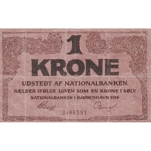 1 KRONE UDSTEDT AF NATIONALBANKEN GÆLDER IFØLGE LOVEN SOM EN KRONE I SØLV NATIONALBANKEN I KJØBENHAVN (Translation: 1 KRONE Issued by the Nationalbank According to Law valid as one krone in silver The Nationalbank in Copenhagen) |