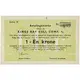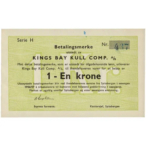 Betalingsmerke utstedt av KINGS BAY KULL COMP. A/S Mot dette betalingsmerke, som er utstedt for tilgodehavende lønn, utleverer Kings Bay Kull Comp. A/S, til ihendehaveren varer for et beløp av 1 - En krone Ubenyttede betalingsmerker til ved ihendehaverens avreise fra Spitsbergen i sesongen 1956/57 å tilbakelevere til kontoret mot beløpets godskrivning i oppgjøret. Merket er ugyldig utenfor Spitsbergen og etter sesongens avslutning. Styrets formann. Kontorsjef, Spitsbergen (Translation: Payment note issued by Kings Bay Coal Company Against this payment note, which is issued for outstanding wages, The Great Norwegian Spitsbergen Coal Company delivers to the bearer goods for an amount of 1 krone Unused notes when the beares departs from Spitsbergen during the season 1956/57 is returned to the office against credit of the amount in the settlement. The note is invalid outside Spitsbergen and after the end of the season. Chairman of the board. Office manager, Spitsbergen.) |