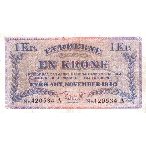 1 Kr. FÆRØERNE 1 Kr. EN KRONE UDSTEDT PAA DANMARKS NATIONALBANKS VEGNE SOM GYLDIGT BETALINGSMIDDEL PAA FÆRØERNE FÆRØ AMT. NOVEMBER 1940 serial number signature/AMTMAND serial number (Translation: 1 Kr. FAROE ISLANDS 1 Kr. One Krone Issued on behalf of the Danish Nationalbank as current payment on Faroe Island Faroe County. November 1940 signature/County Official) |