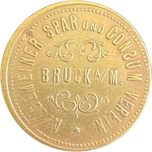 The phrase `Allgemeiner Spar und Consum Verein,` circling the edge of the coin, accompanied by a small star at the end of `Verein` and before `Allgemeiner.` In the center is the phrase `Bruck A/M` with vine-like ornaments above and below. |