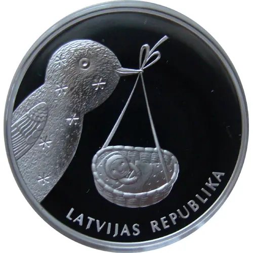 In the center of the obverse, there is a cradle, held by a bird, with a baby in it. The inscription LATVIJAS REPUBLIKA is semi-circled beneath it. |