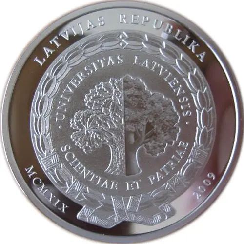 The coat of arms of the University of Latvia is depicted in the centre: an oak, encircled by a laurel wreath, with the inscriptions UNIVERSITAS LATVIENSIS, the name of the University of Latvia in Latin, and SCIENTIAE ET PATRIAE (`To Science and Fatherland`), the motto of the University of Latvia, arranged above and beneath the oak respectively. The oak, with its branches symbolising the faculties, is in the centre of the coat of arms. The left-hand side of the oak is struck in relief whereas the right-hand side is a minted photo image, thus symbolising the `dry` science versus the jolly life. The inscription LATVIJAS REPUBLIKA is arranged in a semicircle above the central motif, with the inscriptions MCMXIX (1919), the foundation year of the University of Latvia, and 2009, the coinage year, semicircled beneath it to the left and right respectively. |
