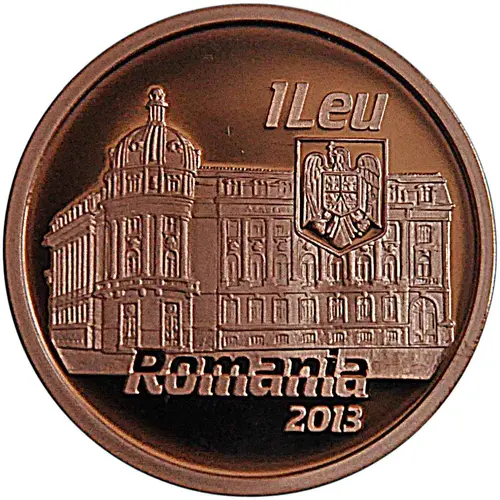 The building of the Bucharest University of Economic Studies; the face value `1 Leu`, Romania`s coat of arms; `Romania` and the year of issue `2013` |