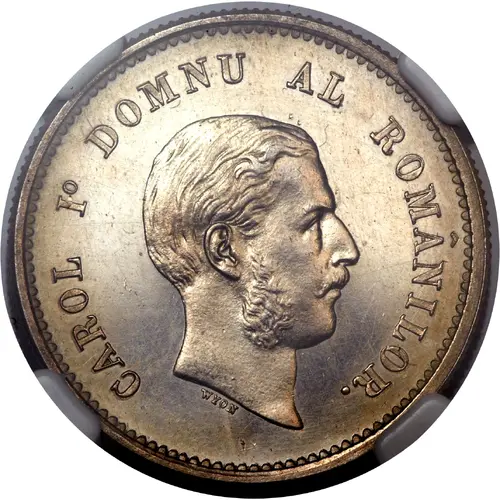 Technical/Grading: As a pattern strike, this 1 Leu coin typically exhibits superior technical qualities. Key high-points for evaluation include Carol I's hair and facial features on the obverse, and individual leaves within the wreath on the reverse. A well-preserved example should display a full, sharp strike, indicating high striking pressure and careful die preparation. Expect crisp legends, distinct denticulation, and potentially a proof-like finish, reflecting its status as a trial piece. Any softness denotes a less than optimal strike.