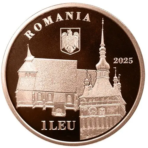 | توضیحات روی سکه | An image of the Church on the Hill and the Clock Tower in Sighișoara, the inscription `ROMANIA` in an arc, the coat of arms of Romania, the year of issue `2025` and the face value `1 LEU` |