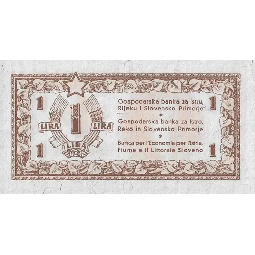 | Obverse lettering | Gospodarska banka za Istru, Rijeku i Slovensko Primorje Gospodarska banka za Istro, Reko in Slovensko Primorje Banca per l`Economia per l`Istria, Fiume e il Littorale Sloveno 1 LIRA 1945 (Translation: Economy bank for Istra, Rijeka and Slovenian Coast in 3 languages (Croatian, Slovenian, Italian).) |
