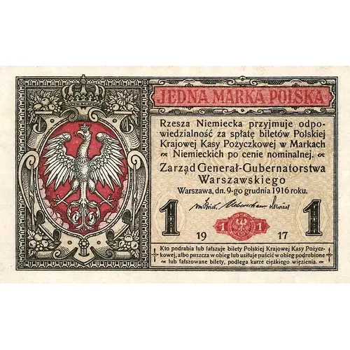 | Obverse lettering | JEDNA MARKA POLSKA Rzesza Niemiecka przyjmuje odpo- wiedzialność za spłatę biletów Polskiej Krajowej Kasy Pożyczkowej w Markach Niemieckich po cenie nominalnej Zarząd Generał- Gubernatorstwa Warszawskiego (Translation: One Polish Mark The German Reich assumes responsibility for repayment of the banknotes of the Polish State Loan Bank in German Marks at face value Management of the General-Government of Warsaw) |
