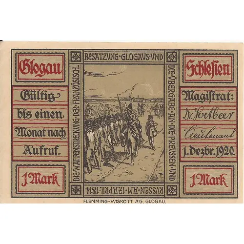 | Obverse lettering | Glogau Schlesien Gültig bis einen Monat nach Aufruf. Magistrat: Dr. Svetbeer Lieutenant 1. Dezbr. 1920. 1 Mark DIE ◦ WAFFENSTRECKUNG ◦ DER ◦ FRANZÖSISCH. BESATZUNG ◦ GLOGAUS ◦ UND DIE ◦ ÜBERGABE ◦ AN ◦ DIE ◦ PREUSSEN ◦ UND RUSSEN ◦ AM ◦ 17. APRIL ◦ 1814 FLEMMING – WISKOTT A · G, GLOGAU. |