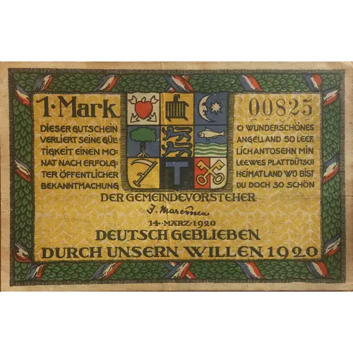 | Obverse lettering | 1 Mark 00825 DIESER GUTSCHEIN VERLIERT SEINE GÜLTIGKEIT EINEN MONAT NACH ERFOLGTTER ÖFFENTLICHER BEKANNTMACHUNG O WUNDERSCHÖNES ANGELLAND SO LEEF. LICHANTOSEHN MIN LEEWES PLATTDÜTSCH HEIMATLAND WO BIST DU DOCH SO SCHÖN DER GEMEINDEVORSTEHER 14.MARZ.1920 DEUTSCH GEBLIEBEN DURCH UNSERN WILLEN 1920 |