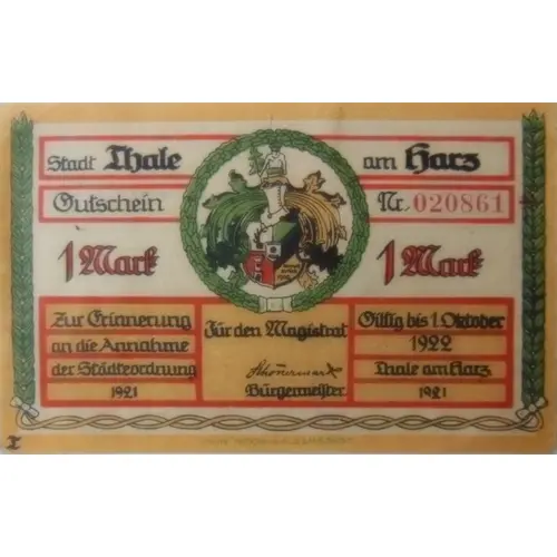Stadt Thale am Harz Gutschein Nr. 1 Mark Zur Erinnerung an die Annahme der Städteverordnung 1921 Für den Magistrat Bürgermeister Gültig bis 1. Oktober 1922 Thale am Harz (Translation: City of Thale at the Harz mountains Voucher No. 1 Mark Reminder of the adoption of the Urban Ordinance 1921 For the Magistrate Mayor Valid until October 1, 1922 Thale at the Harz mountains) |
