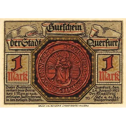 Gutschein der Stadt Querfurt 1 Mark Dieser Gutschein verliert seine Gültig- keit 1 Monat nach erfolgter Aufforderung in den hiesigen Blättern. Querfurt, den 24. August 1921 |